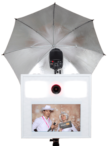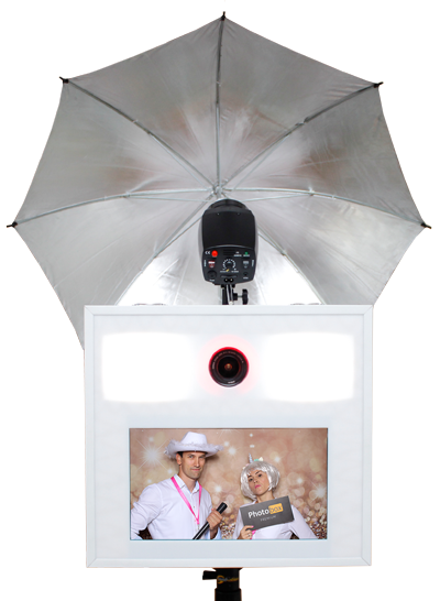 An open air photo booth consists of a professional camera, flash, touchscreen computer and photo printer assembled and setup as a open portable system.